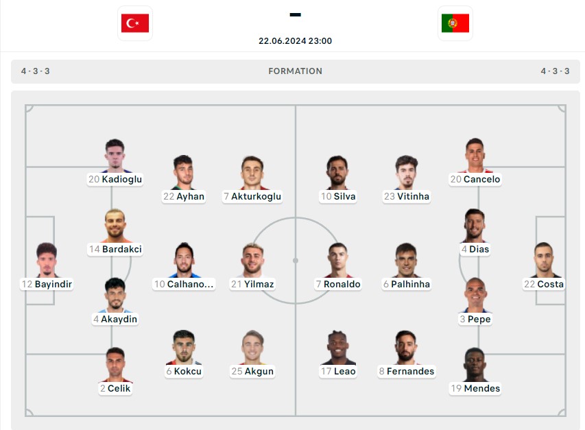 Bồ Đào Nha: Costa; Dalot, Dias, Pepe, Cancelo; Vitinha, J. Neves, Fernandes; Jota, Ronaldo, Silva.