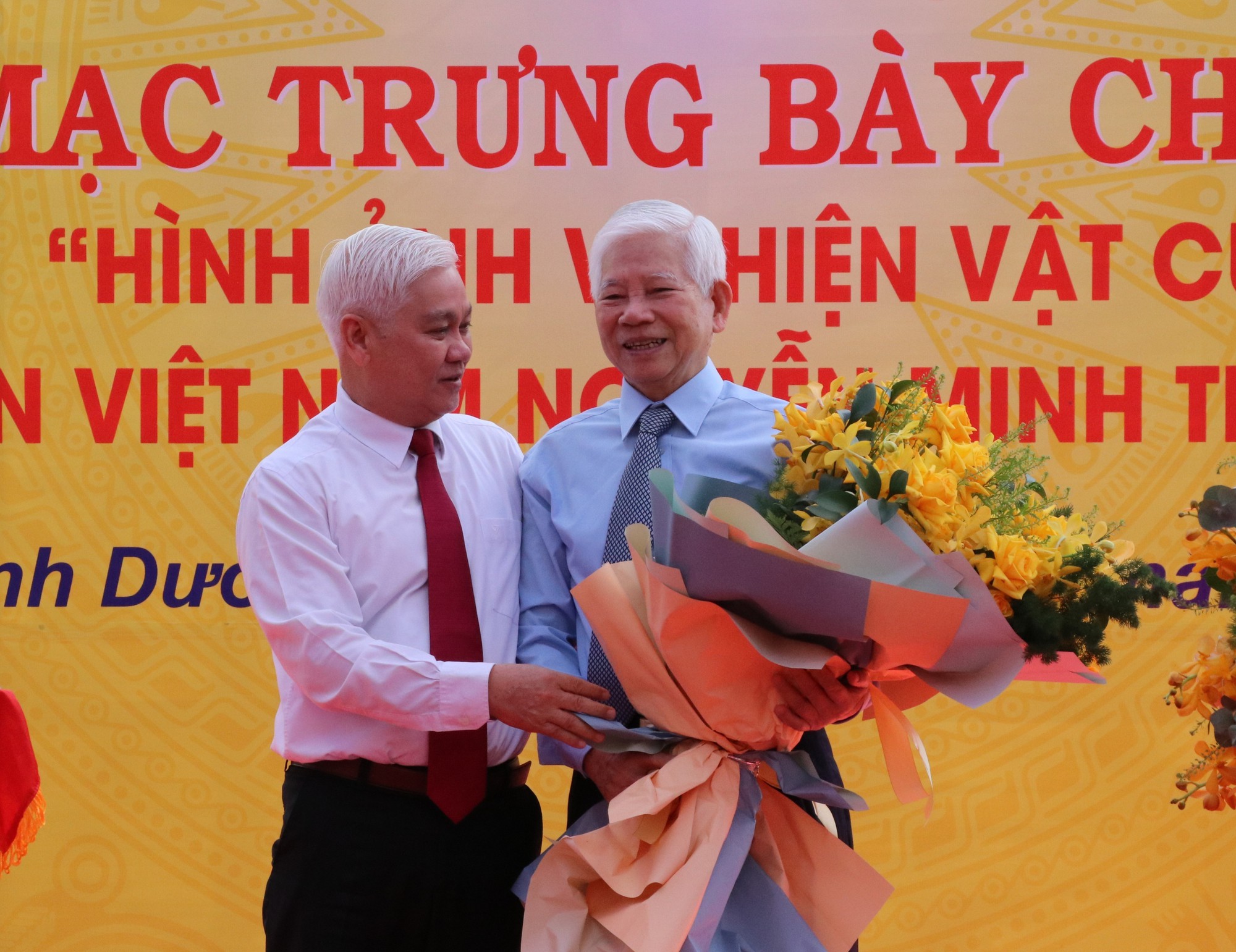 Bí thư Tỉnh ủy Bình Dương Nguyễn Văn Lợi tặng hoa cho nguyên Chủ tịch nước Nguyễn Minh Triết tại buổi khai mạc trưng bày chuyên đề “Hình ảnh và hiện vật của Nguyên Chủ tịch nước Nguyễn Minh Triết, giai đoạn 2006 -2011”. Ảnh: Chí Tưởng -TTXVN
