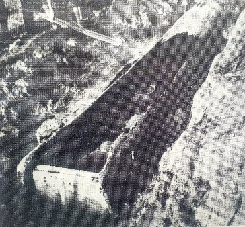 Hình trái: mộ Việt Khê khi mới phát hiện; hình phải: những mũi giáo đồng Đông Sơn còn nguyên cán gỗ trong mộ Việt Khê (phần cán gỗ đã được rút ra)