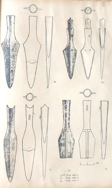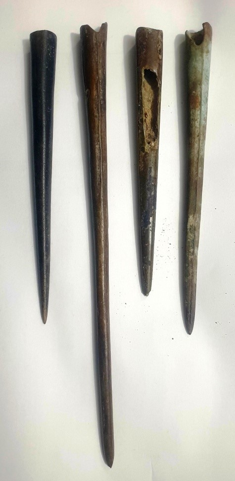 Hình trái: các mũi nhọn Đông Sơn ngờ là phần đầu đốc cán giáo. Hình giữa và hình phải: đầu đốc cán và phần tiếp lưỡi của cây giáo thời nhà Mạc (thế kỷ 16). Sưu tập Bảo tàng Phạm Huy Thông