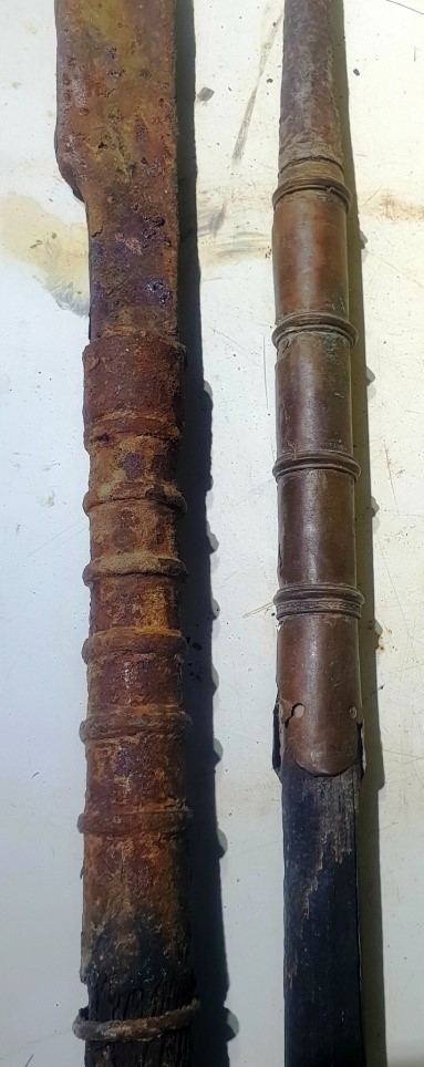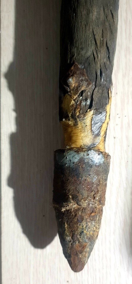 Hình trên: nguyên trạng một cây giáo (lao) Đông Sơn khai quật trong mộ thân cây khoét rỗng ở Yên Bắc, Duy Tiên, Hà Nam (cũ). Hình dưới: đặc tả chi tiết phần họng tra cán của mũi giáo (lao), vẫn còn vết nhựa cây kết dính. Sưu tập Bảo tàng Phạm Huy Thông