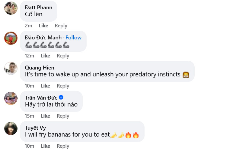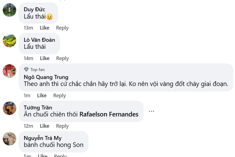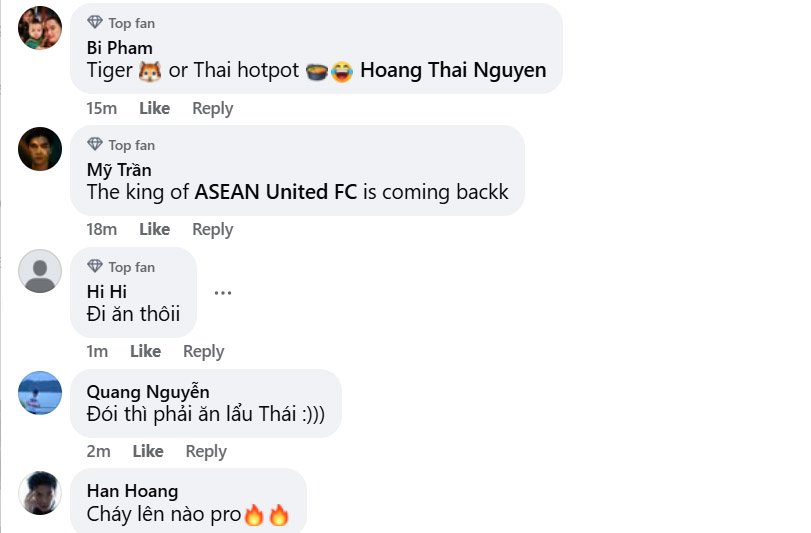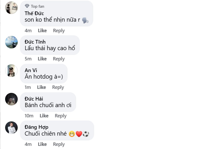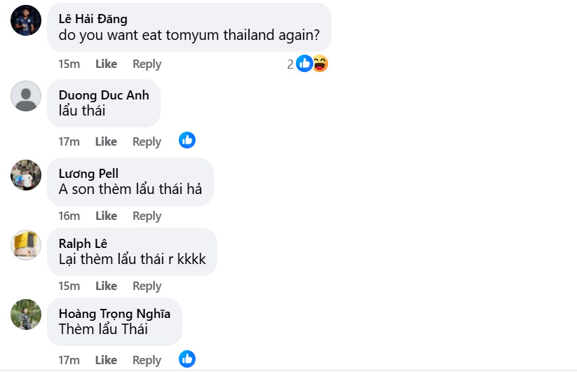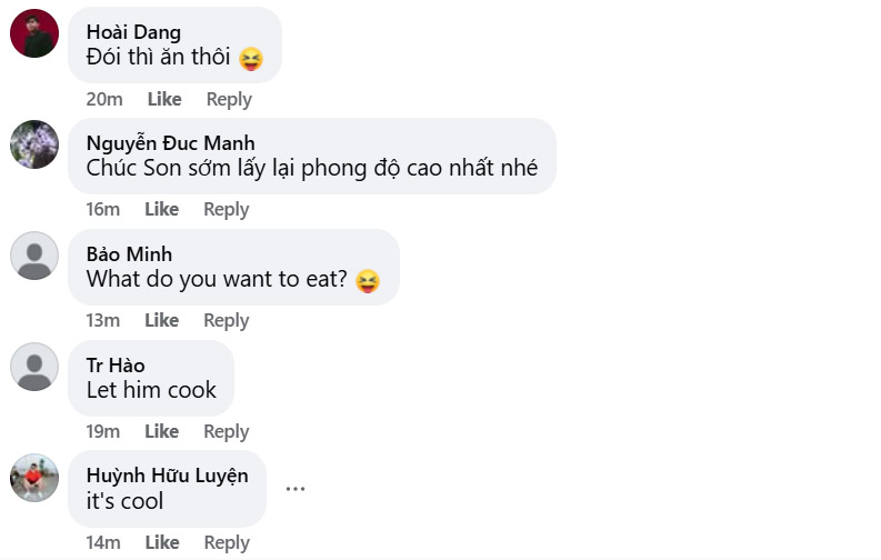 Đói. Không phải đói cơm, mà là đói bàn thắng, đói danh hiệu, đói được ra sân khoác áo "Rồng vàng" lần nữa. Bình luận dưới bức ảnh, khá nhiều CĐV Việt Nam cũng tỏ ra hào hứng không kém. Ngoài một số lời trêu đùa rủ Xuân Son ăn "chuối chiên" - món khoái khẩu của anh, các CĐV cũng không quên bình luận đầy ẩn ý về việc "ăn lẩu Thái" (Thái Lan) hay "ăn thịt Hổ" (Malaysia).